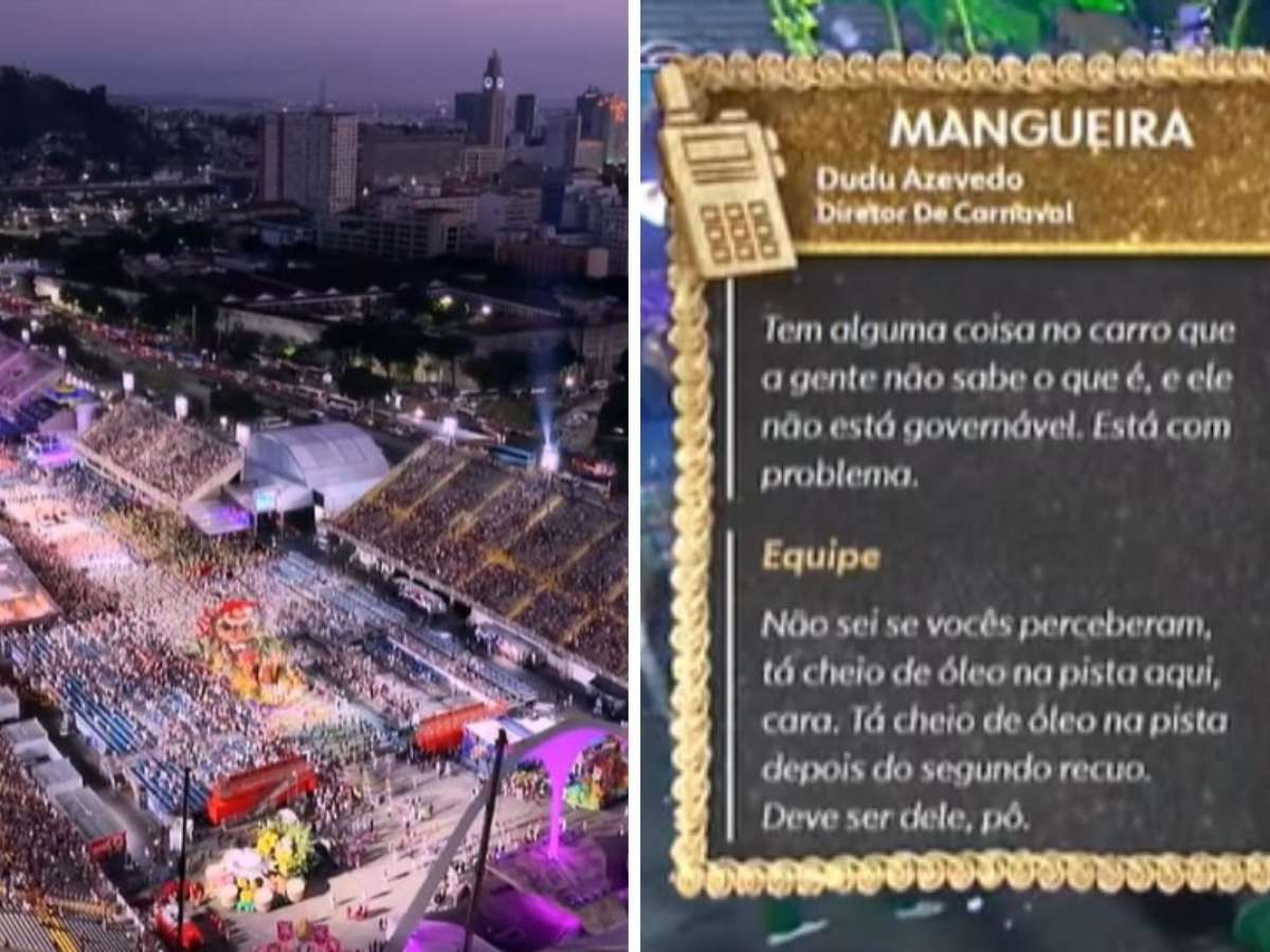 Dudu Azevedo, diretor de carnaval, afirmou: “Tem alguma coisa no carro que a gente não sabe o que é, e ele não está governável. Está com problema”. Em seguida, alguém da equipe respondeu: “Não sei se vocês perceberam, está cheio de óleo na pista aqui, cara. Está cheio de óleo na pista depois do segundo recuo. Deve ser dele, pô”.