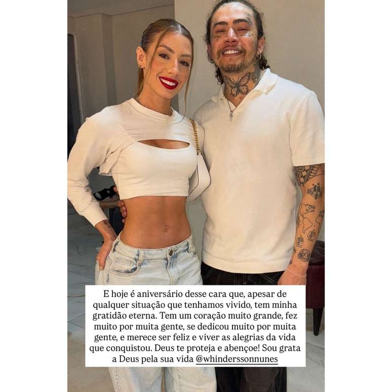 Na sequência, a influenciadora fez questão de exaltar qualidades pessoais do ex-companheiro. "Tem um coração muito grande, fez muito por muita gente, se dedicou muito por muita gente, e merece ser feliz e viver as alegrias da vida que conquistou. Deus te proteja e abençoe! Sou grata a Deus pela sua vida Whindersson Nunes", escreveu, encerrando a homenagem de forma afetuosa.