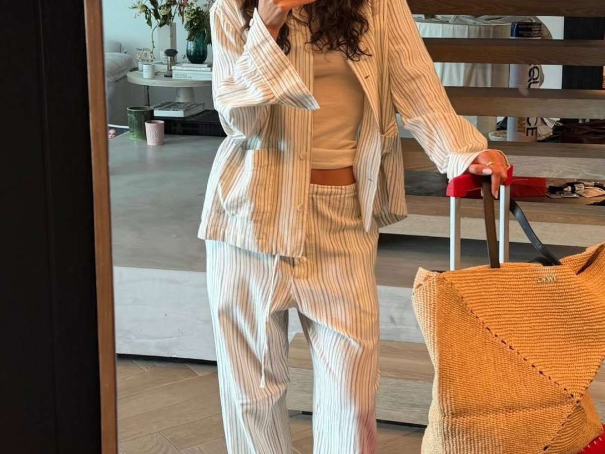 Nos Stories do Instagram, Marquezine apareceu com look confortável para a viagem. A escolha incluiu camisa listrada, baby look branca e calça larga na mesma estampa.