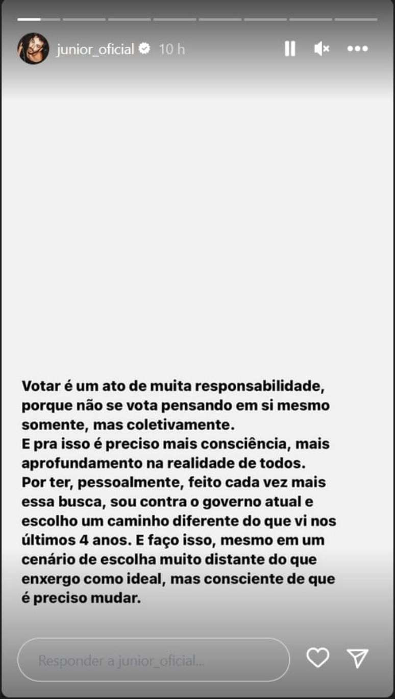 "Votar é um ato de muita responsabilidade, porque não se vota pensando em si mesmo somente, mas coletivamente", iniciou Júnior. "E para isso é preciso mais consciência, mais aprofundamento na realidade de todos. Por ter, pessoalmente, feito cada vez mais essa busca, sou contra o governo atual e escolho um caminho diferente do que vi nos últimos quatro anos".