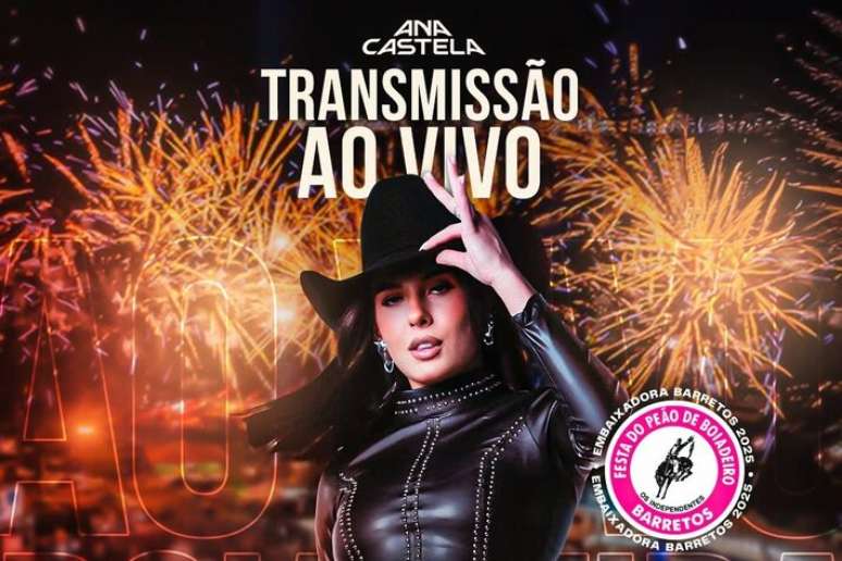 "Primeira vez da festa na TV aberta e eu que vou chegar chegando", escreveu a cantora em seu perfil no Instagram. Em março, Ana Castela foi nomeada Embaixadora da Festa do Peão de Barretos. A indicação foi anunciada como parte da programação oficial do evento e marca a presença da artista na agenda deste ano.