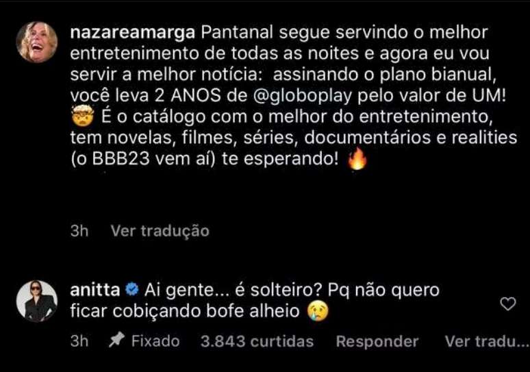 "Ai, gente… é solteiro? Porque não quero ficar cobiçando bofe alheio", questionou Anitta nos comentários de uma publicação do perfil @nazareamarga, no Instagram.