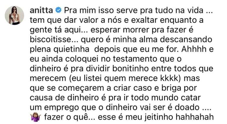 "É para dividir tudo bonitinho entre os que merecem. Eu listem quem merece", avisou Anitta. "Se começarem a brigar por causa de dinheiro, todo mundo vai ter que arrumar um emprego e o dinheiro será doado. Fazer o quê? Esse é o meu jeitinho", concluiu.