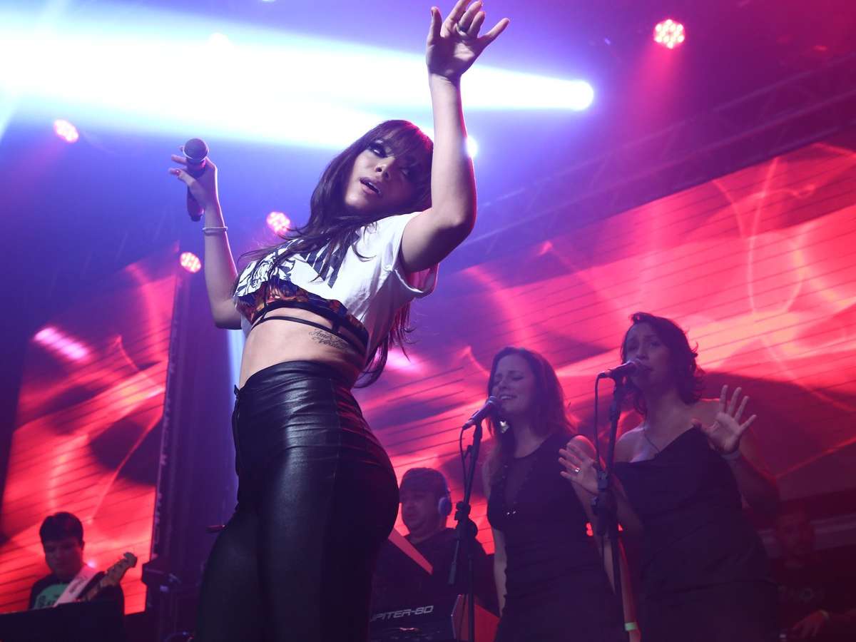A dona do hit Show das Poderosas apareceu no palco com franjinhas nos cabelos e calça de couro justinha, salto alto e barriga de fora.
