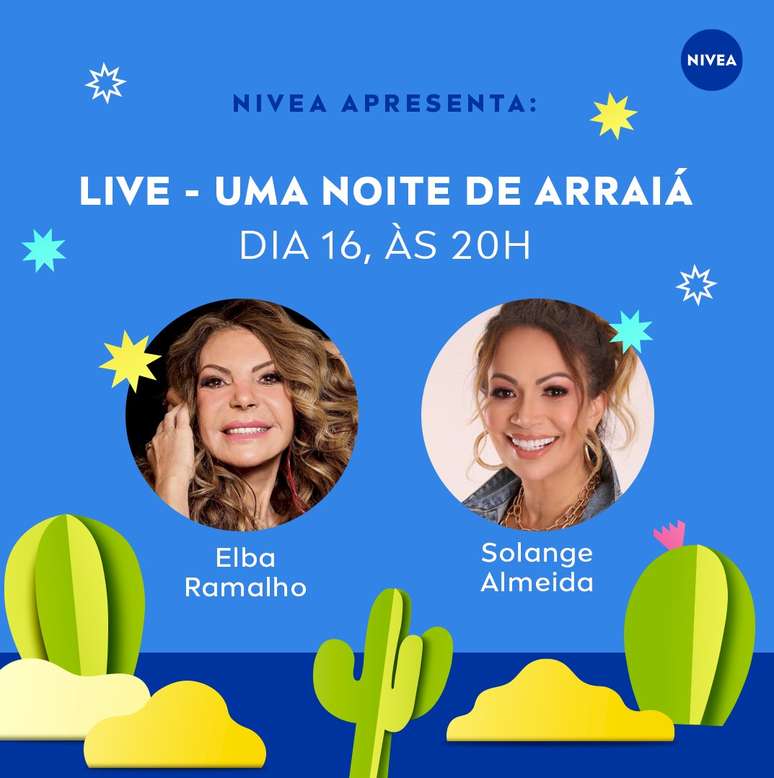 Nesta sexta-feira (16), a partir das 20h, o Teatro Riachuelo vai abrir seu palco para um arraiá virtual especial e solidário. O festejo julino apresentado pela marca Nivea contará com a presença de duas grandes artistas, que simbolizam com muito talento a segunda maior festa popular do país: a paraibana Elba Ramalho convida a baiana Solange Almeida para exaltar as tradições nordestinas com muito forró e versões juninas de grandes hits.