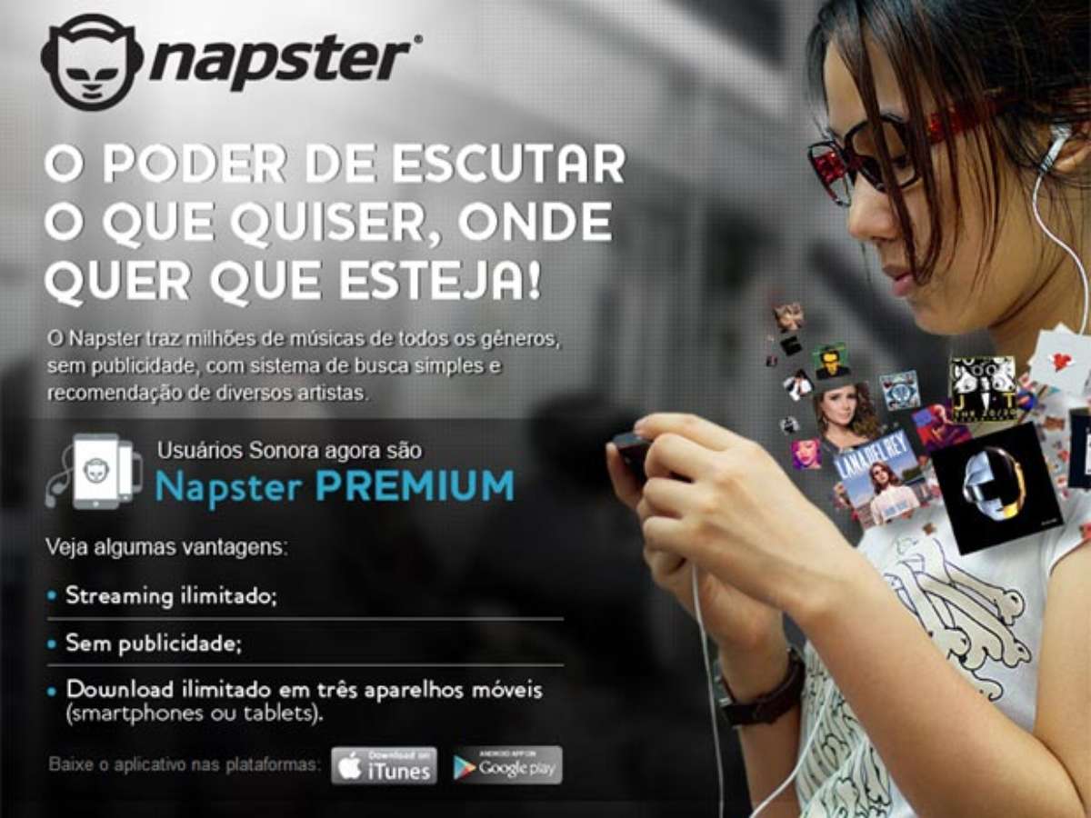 O Napster é um dos principais serviços de assinatura de música digital do mundo. Pertencente à empresa americana Rhapsody, o Napster combina a história icônica de uma das mais conhecidas marcas de música digital com a vasta experiência e plataforma tecnológica da Rhapsody, que foi o primeiro serviço de assinatura musical. O Napster oferece uma das mais completas coletâneas de música online e garante acesso à biblioteca em qualquer lugar, em centenas de dispositivos. Rhapsody, Napster e seus logos são marcas registradas da Rhapsody Internacional Inc.
