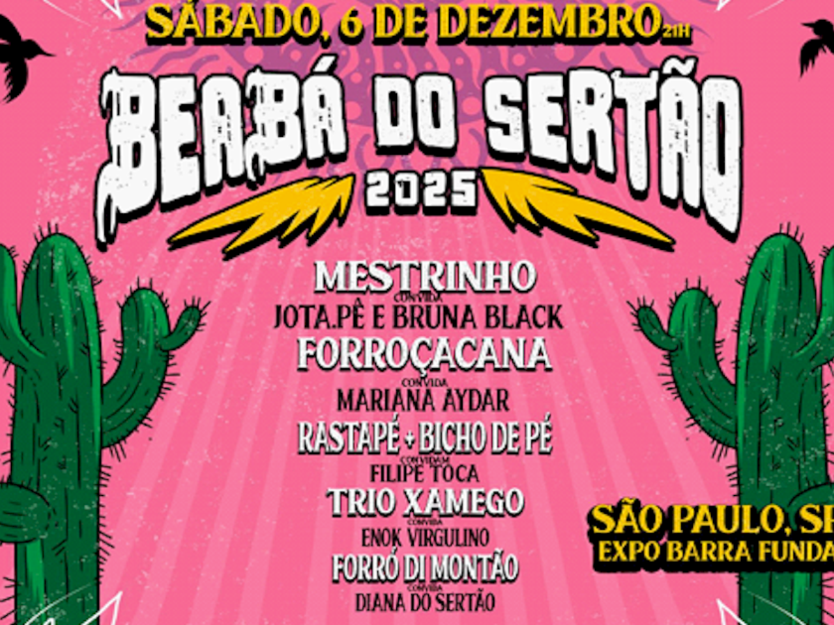 No dia 6 de dezembro de 2025, o Expo Barra Funda será palco de uma grande celebração da cultura nordestina e de seus ritmos. Chega a São Paulo o Beabá do Sertão 2025, novo festival dedicado ao forró que vai apresentar shows completos de Mestrinho, Forroçacana, Rastapé, Bicho de Pé, Trio Xamego e do projeto Forró di Montão com as participações especiais de Jota.pe, Mariana Aydar, Filipe Toca, Bruna Black, Enok Virgulino e Diana do Sertão.