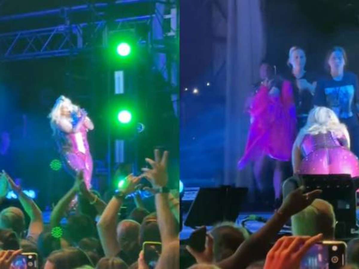 Em outro registro compartilhado na rede, a cantora é levada do palco pela equipe e acena para a plateia.