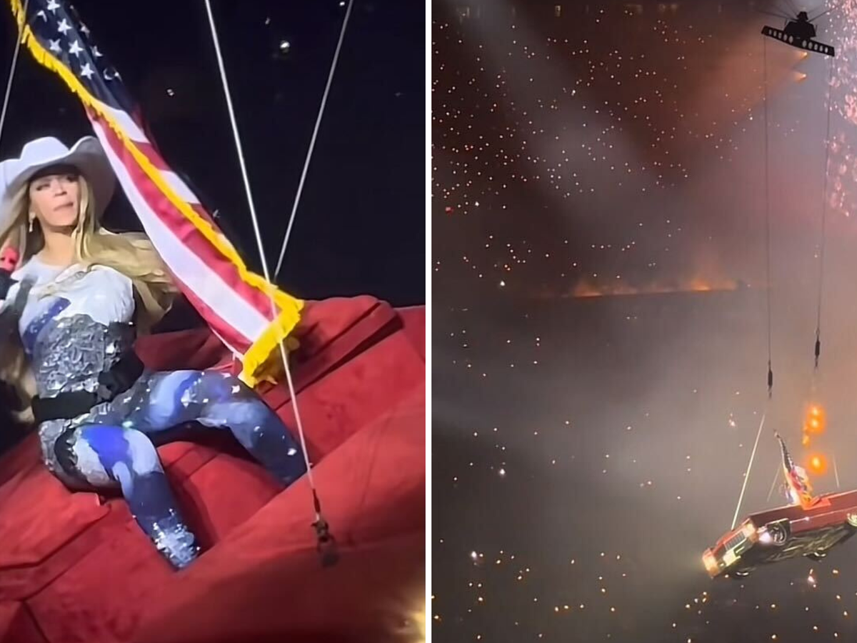 O momento aconteceu no sábado, 18, no primeiro dia de show da turnê Cowboy Carter, em Houston, no Texas, cidade natal da cantora. Durante a apresentação de 6 Carriages, canção que integra o último álbum, Beyoncé fica em um conversível vermelho suspenso e sobrevoa os espectadores, no entanto, desta vez o truque deu errado.
