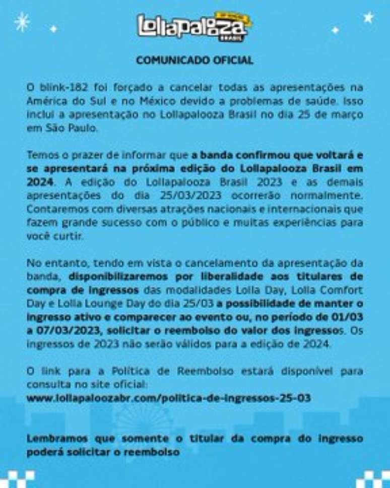 O Lollapalooza 2023 vinha se transformando extra-oficialmente no “Festival do retorno do Blink” com a formação original e clássica. Mas o guitarrista e vocalista Tom DeLonge postou vídeo anunciando que não será desta vez que o grupo marcará esse retorno perante os fãs sul-americanos.