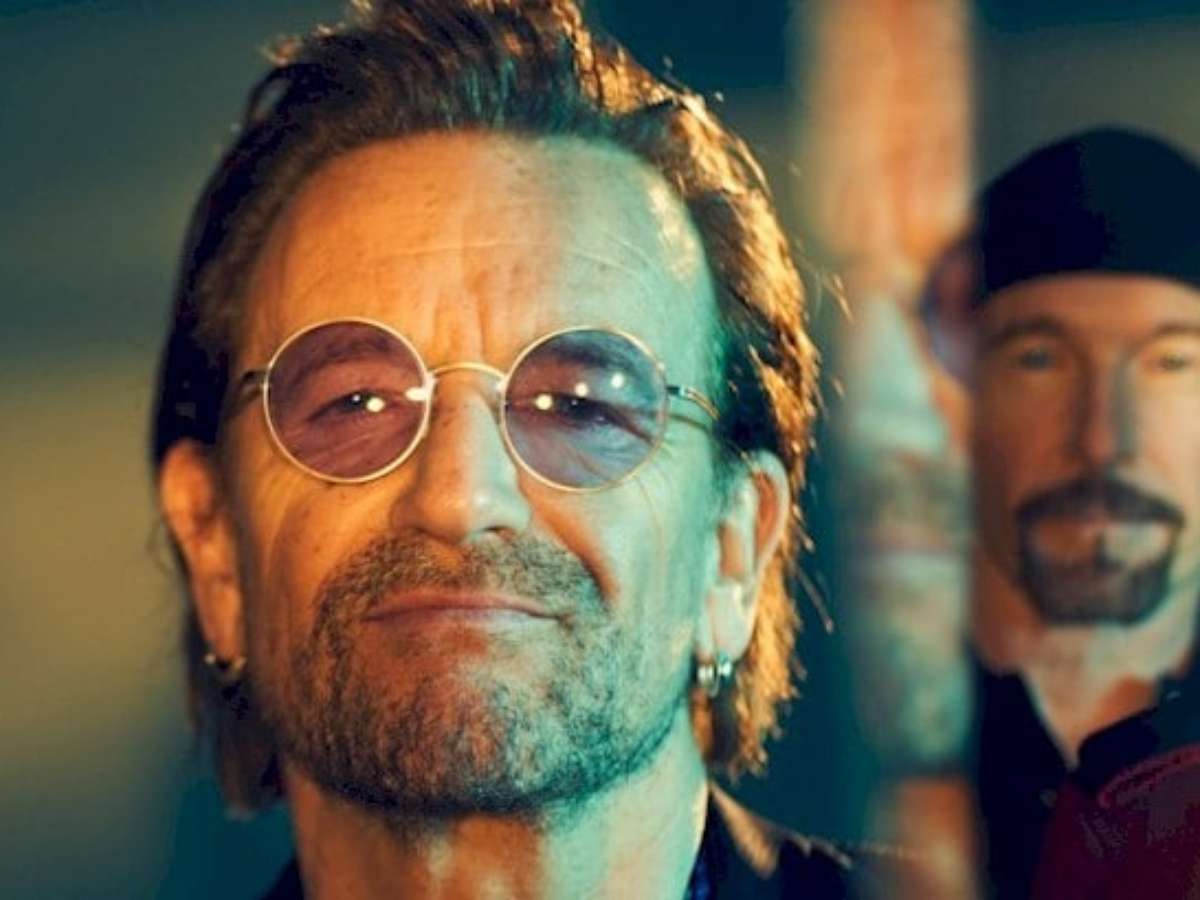 O vídeo inicia com a mensagem: "Com amor, Bono & Edge".