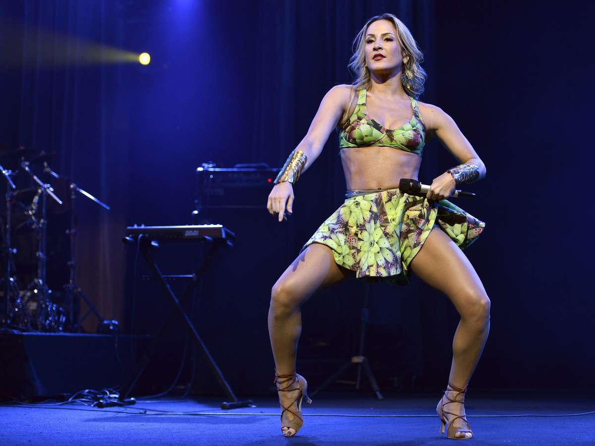 A cantora brasileira, dona do hit Largadinho, usou uma saia rodada e um top, que deixava sua barriga chapada à mostra.