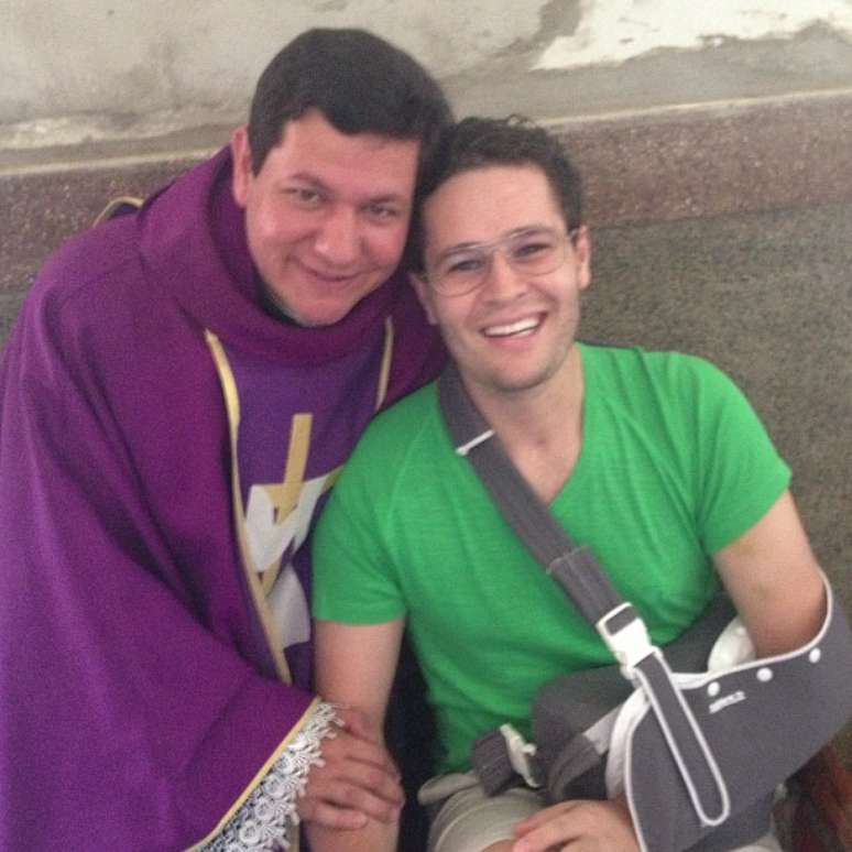 Com braço imobilizado, Pedro Leonardo posta foto com padre