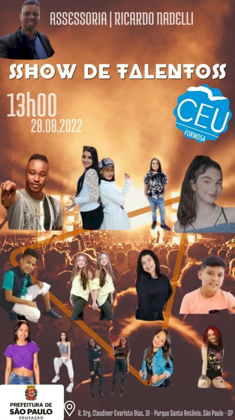 Neste domingo (28) será realizado o evento Show de Talentos no CEU Formosa, situado no bairro da Vila Formosa, zona leste de São Paulo. Promovido pela RN Assessoria Artística, o intuito do evento é descobrir novos talentos, com observação sobre as versatilidades de cada jovem na música, além de desfile de moda para os modelos divulgarem seu portfólio.