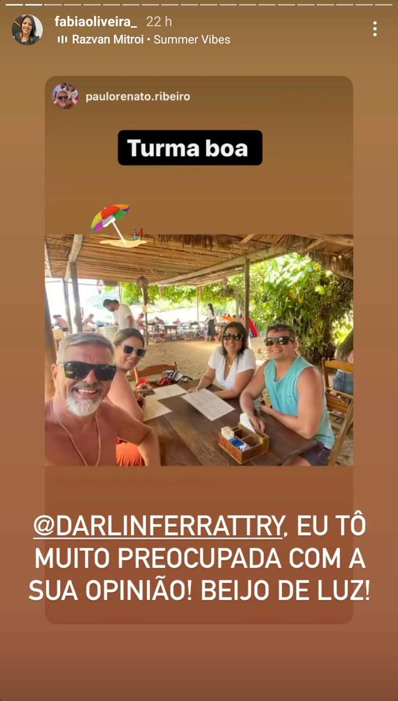 Fabia que está curtindo o carnaval em Paraty (RJ), longe das aglomerações e festas do Rio, compartilhou nos stories do seu Instagram, uma foto ao lado de amigos com uma mensagem direcionada a mãe da famosa:"Darlin Ferrattry eu tô muito preocupada com sua opinião! Beijos de luz!".