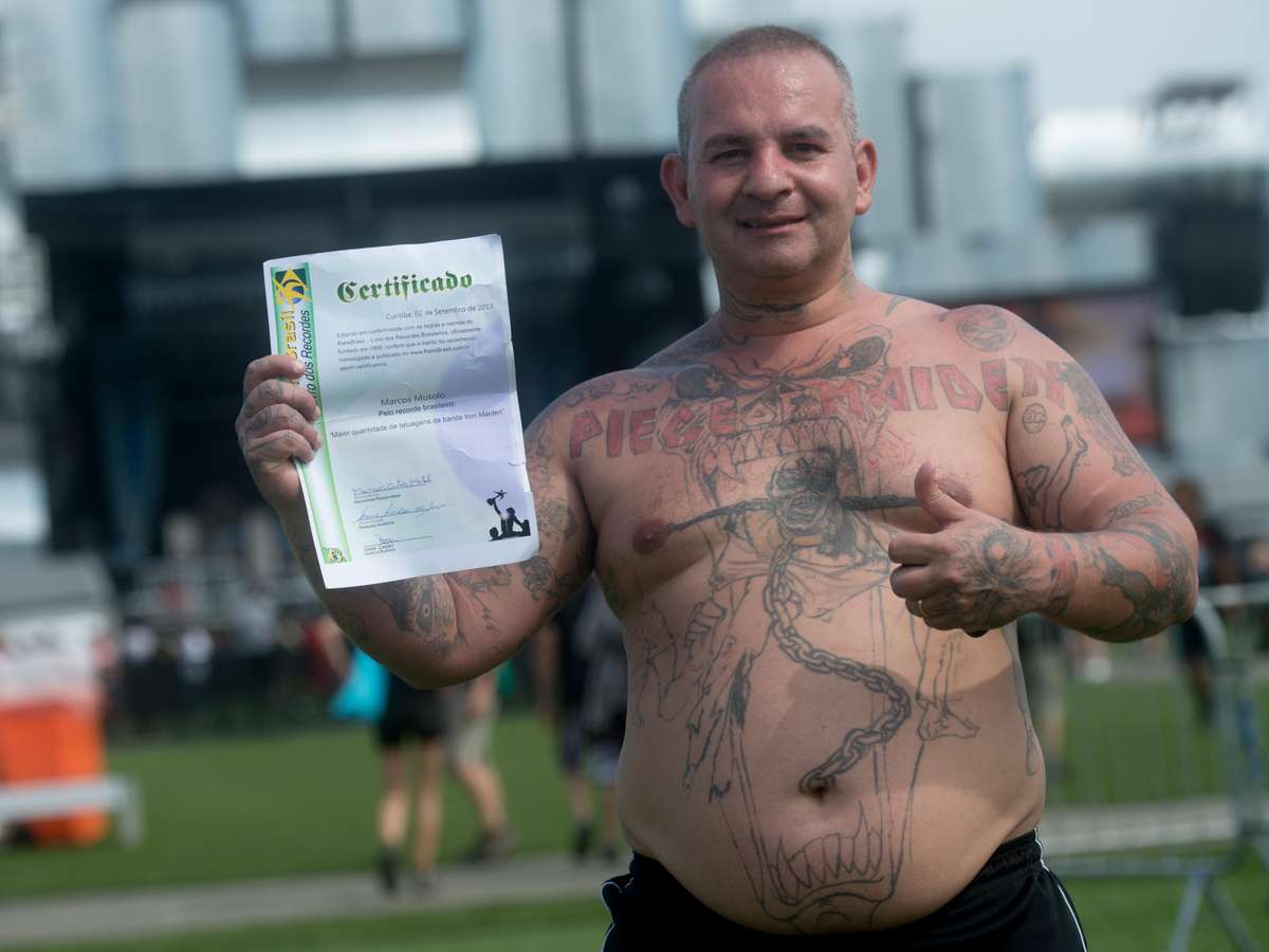 "A primeira é essa do meu peito, do Piece of Maden, fã clube que eu montei em 1995. Eu já gostava desses caras antes de eles serem famosos por aqui", garantiu o 'Iron-Maiden-maníaco', que tem o registro oficial do RankBrasil, o Livro dos Recordes Brasileiros, como o fã brasileiro com "a maior quantidade de tatuagens da banda Iron Maiden", como diz o certificado que ele, orgulhoso, exibe pela Cidade do Rock.