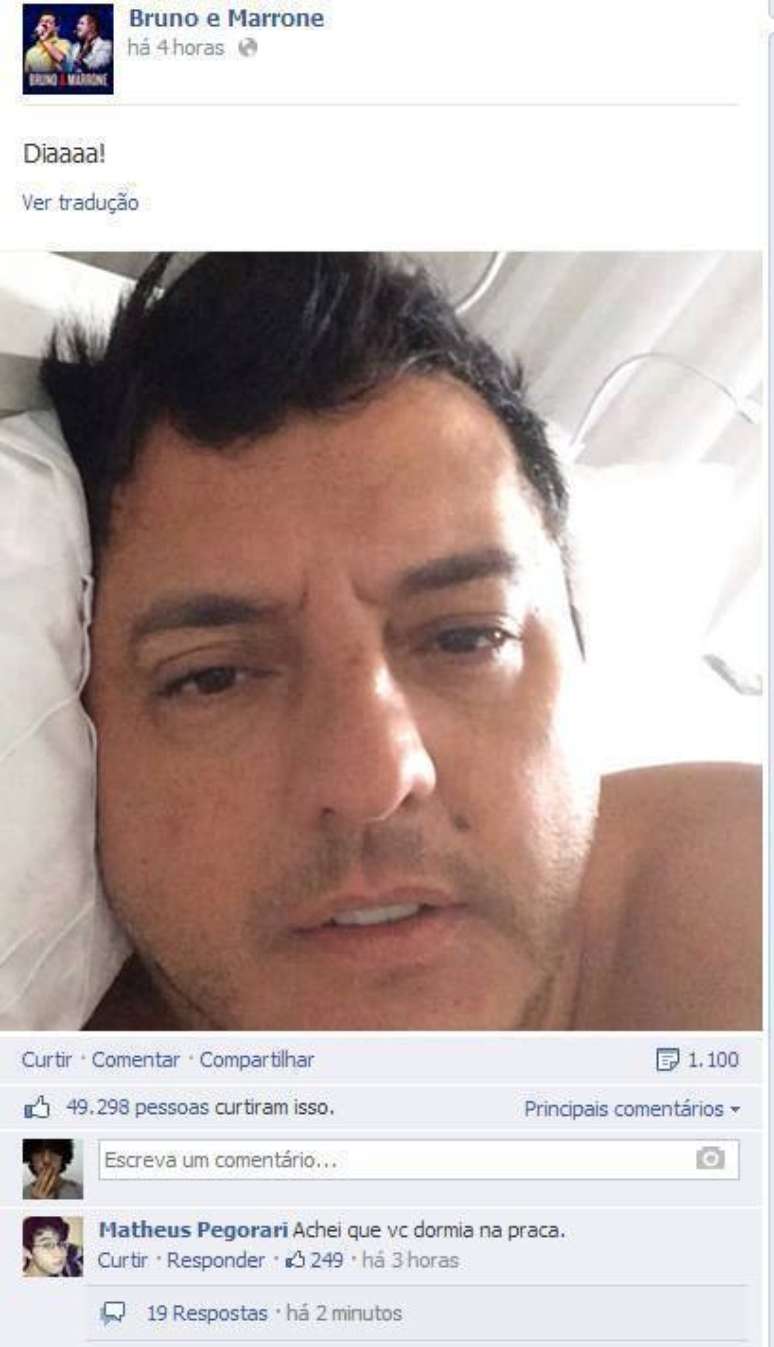 Na última quarta-feira (4), o cantor Bruno, da dupla Bruno & Marrone, usou o seu perfil oficial no Facebook para postar uma foto ao acordar, desejando bom dia aos fãs.