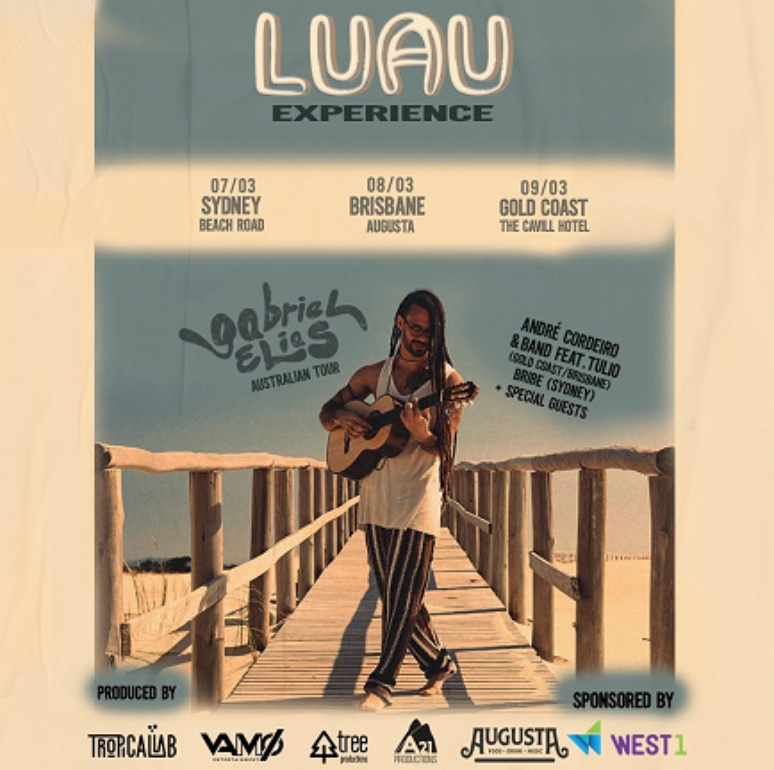 Os ingressos estão disponíveis na Eventbrite australiana em: https://www.eventbrite.com.au/e/luau-experience-gabriel-elias-autralian-tour-2025-tickets-1262043539199