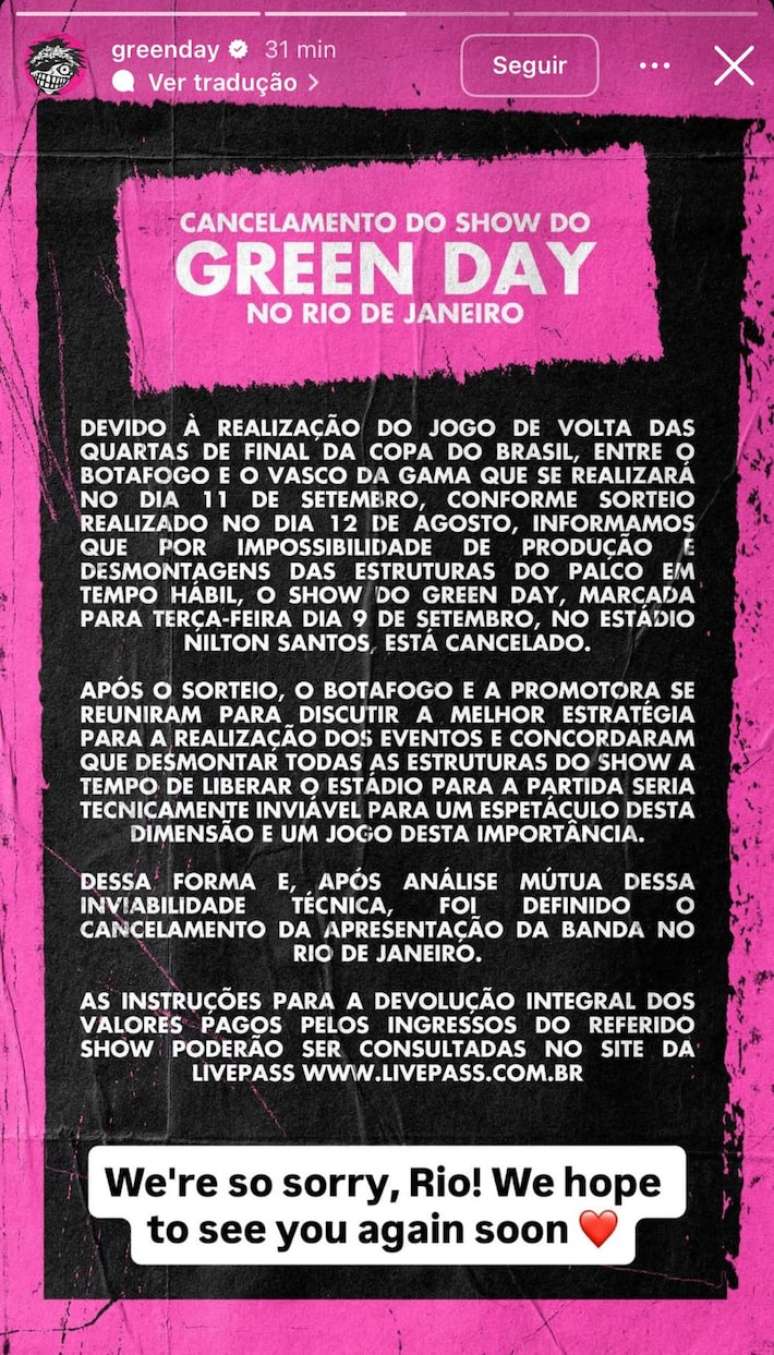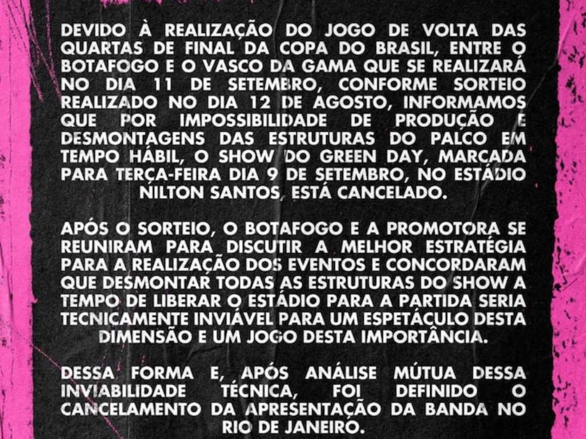 "Informamos que por impossibilidade de produção e desmontagens das estruturas do palco em tempo hábil, o show do Green Day, marcado para terça-feira, dia 9 de setembro, no Estádio Nilton Santos, está cancelado", diz a nota.