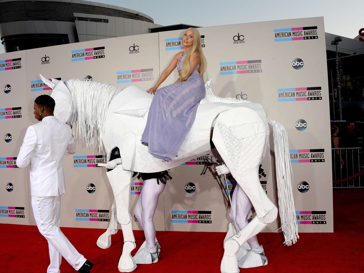 Quando se veste modestamente, Lady Gaga é destaque de outra maneira. Neste domingo (24), a cantora chegou montada em uma cavalo cênico, conduzido por dois homens, à 41ª do America Music Awards, em Los Angeles
