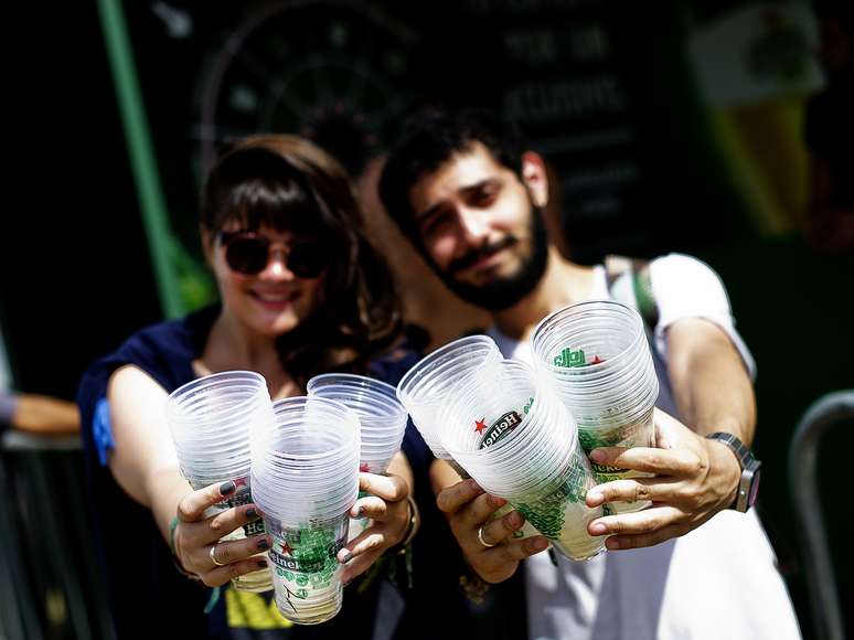 A cada dez copos recolhidos no Lollapalooza, público pode girar a roleta no estande da Heineken e trocar por prêmios, como a estudante Beatriz Marques. "Cheguei aqui e quis tentar para ver como é que é, pedindo para quem estava com os copos, só por curiosidade", disse