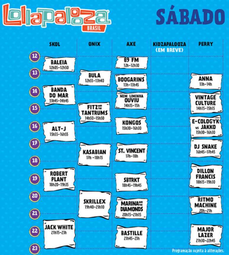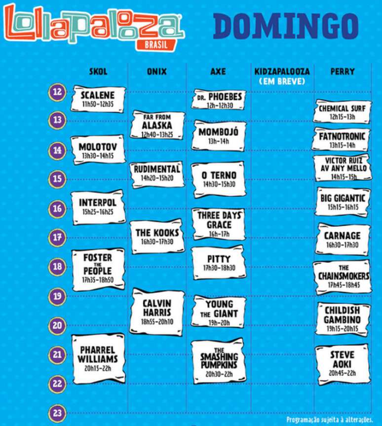 Os horários definidos, que ficarão completos com as atrações do Kidzapalooza, até agora incluem 48 performances, distribuídas entre o meio-dia e 23h, somando 55 horas de música e outras atividades ininterruptas.
