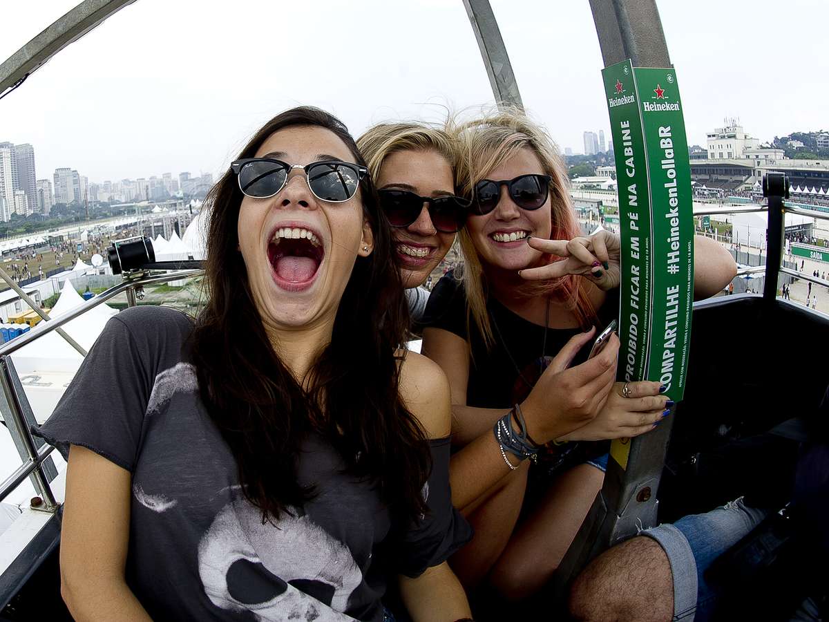 A fila da roda-gigante não intimidou o público dos três dias do Lollapalooza. As amigas gaúchas Jéssica Venturini, 20 anos, Yelana Lattik, 21, e Paulla Mietlicki, 20, que preferiram perder parte do show do Foals para subir na atração