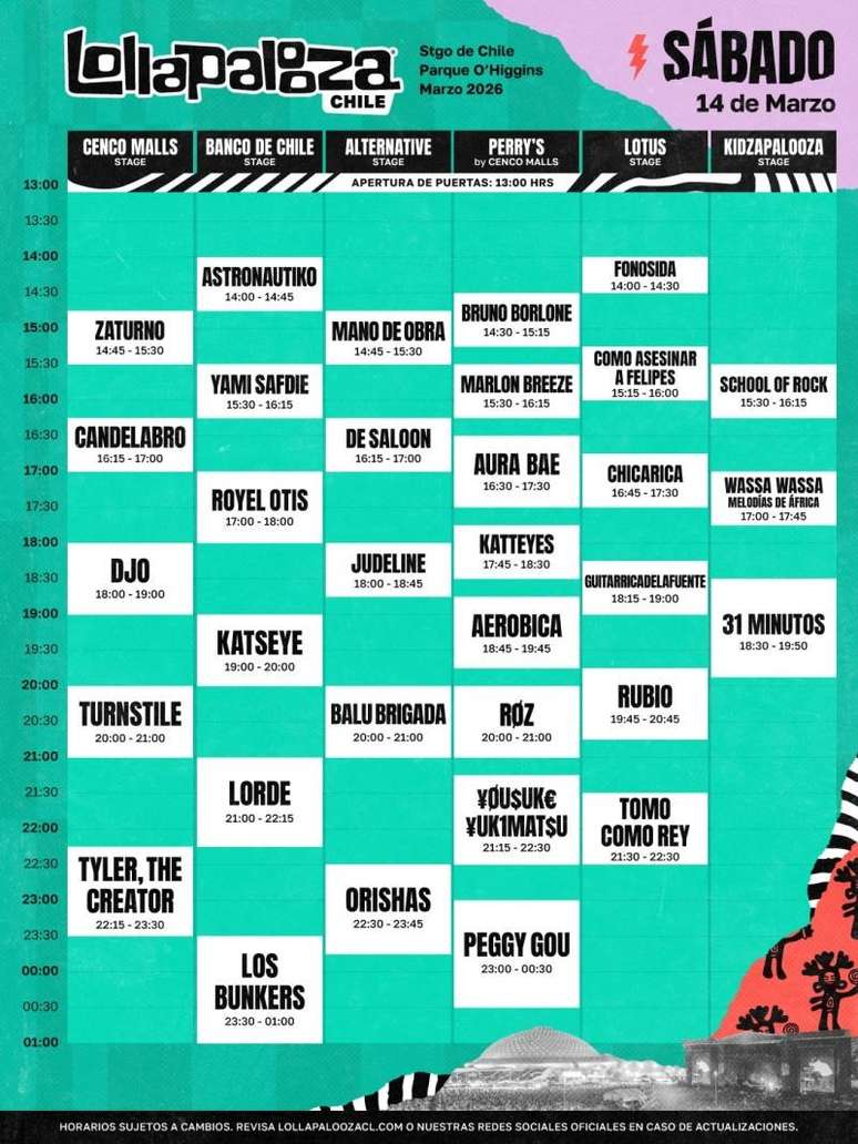 O Lollapalooza Chile 2026 começa nesta sexta-feira, 13, com dezenas de shows no Parque O'Higgins, em Santiago, capital chilena. O lineup mistura revelações do pop atual, lendas do rock alternativo e diversas atrações da cena indie, com apresentações que irão acontecer até domingo, 15.