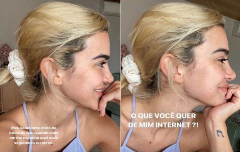 Gavassi foi ao stories e desabafou, irônica, juntamente com uma montagem de fotos: "Meu semblante rindo da ironia de que quanto mais eu me exponho aqui, mais seguidores eu perco. O que você quer de mim, internet?", disse.