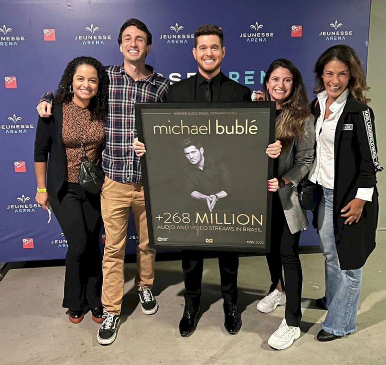 O cantor e compositor canadense Michael Bublé, um dos grandes expoentes do jazz e standards deste século, recebeu uma placa comemorativa da Warner Music Brasil pelos seus mais de 268 milhões de plays combinados de áudio e vídeo no país.