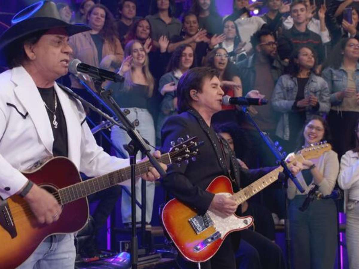 Chitãozinho e Xororó no aniversário do 'Altas Horas', de Sergino Groisman, na Globo.