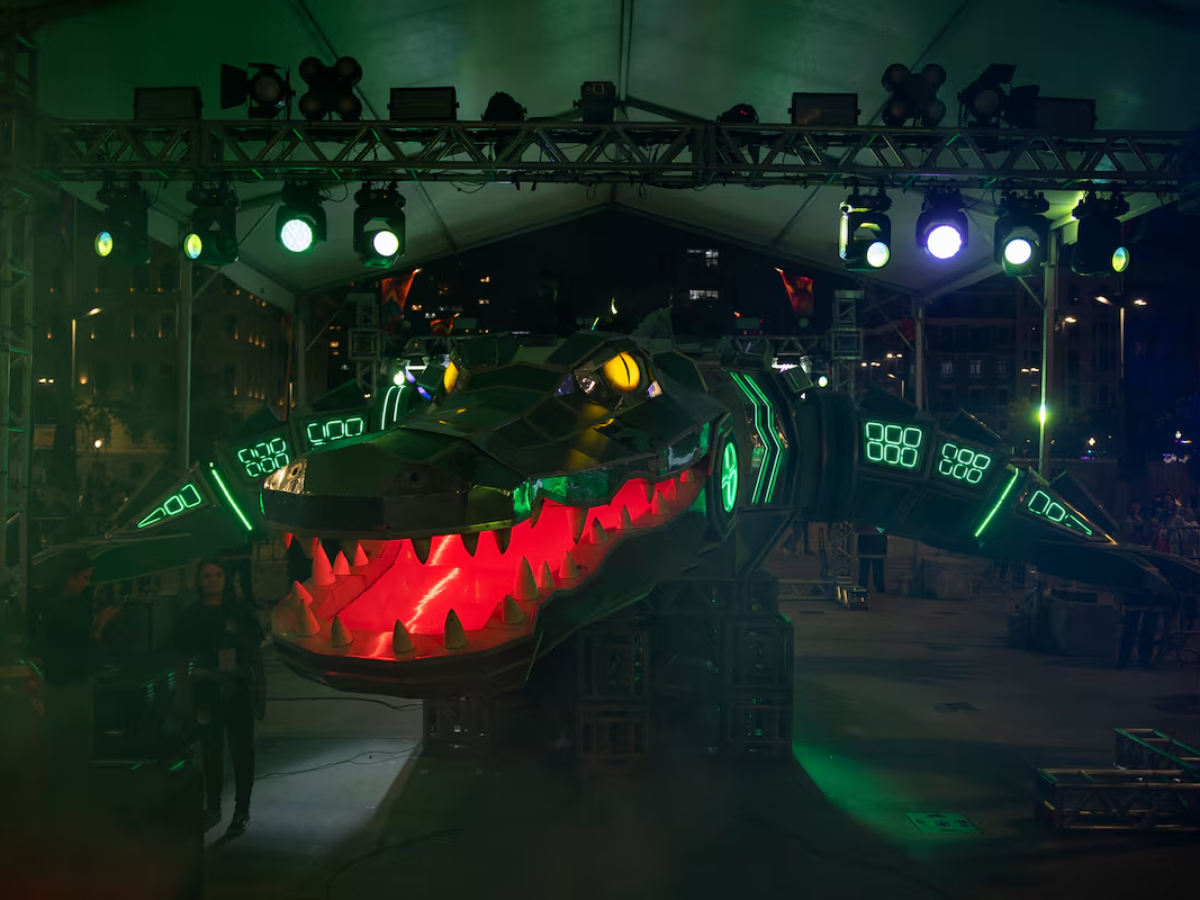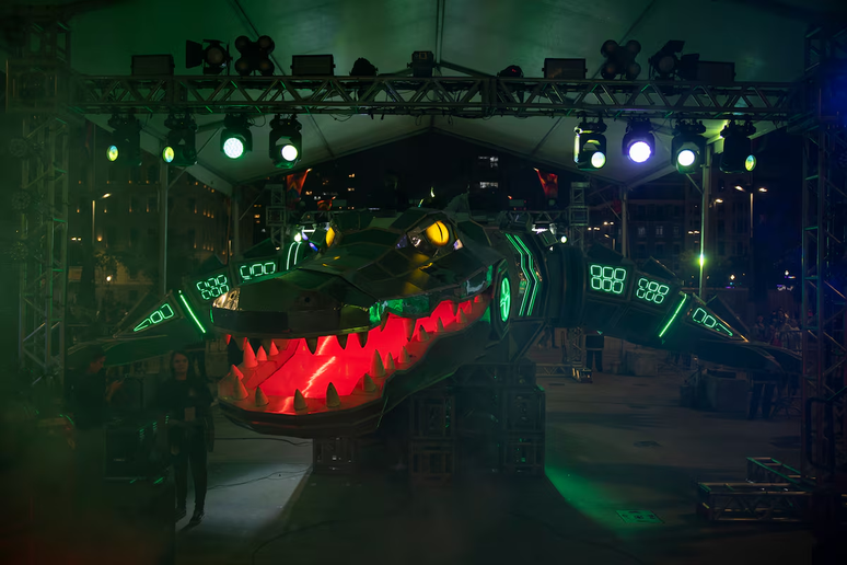 A performance, que mistura tradição, tecnologia e os maiores hits do Pará em um único show, foi comandada pelo DJ Marlon Beats e chamou atenção por um componente inusitado — um crocodilo metálico de 9 metros de comprimento e cerca de 3 metros de altura.