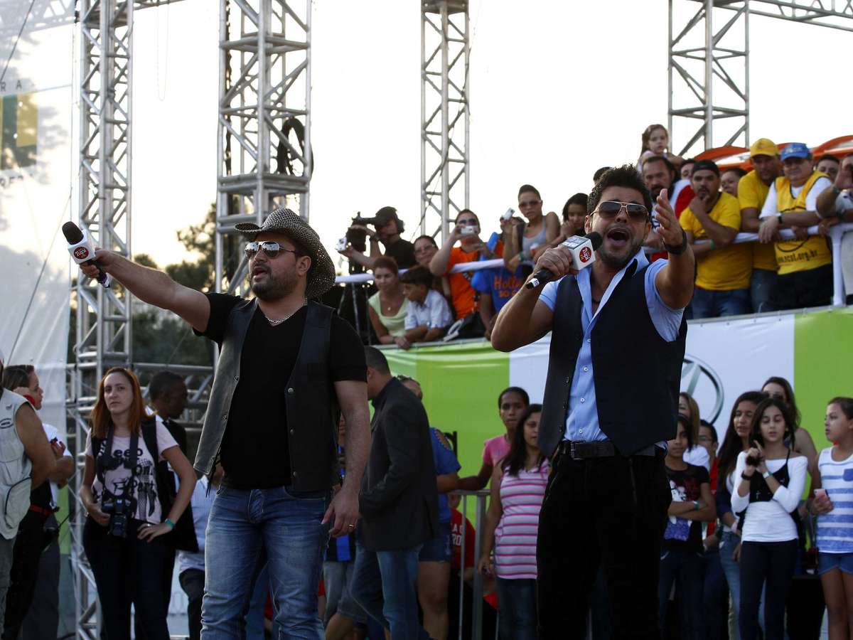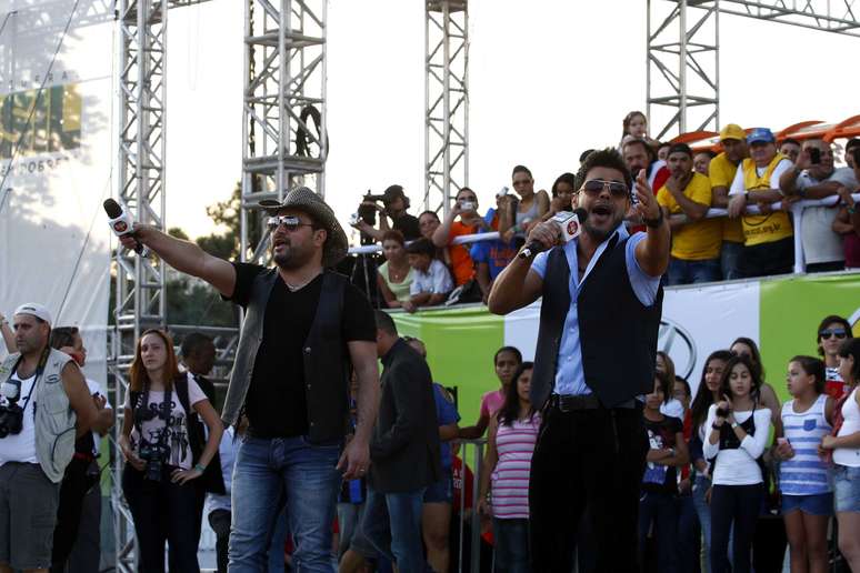 Comemorando o feriado do dia do trabalhador, nesta quarta-feira (1), o paulistano aproveitou para se divertir com shows de sertanejos no Vale do Anhagabaú, no centro de São Paulo. Na foto, Zezé di Camargo & Luciano agitam o plateia