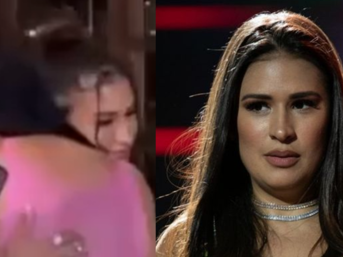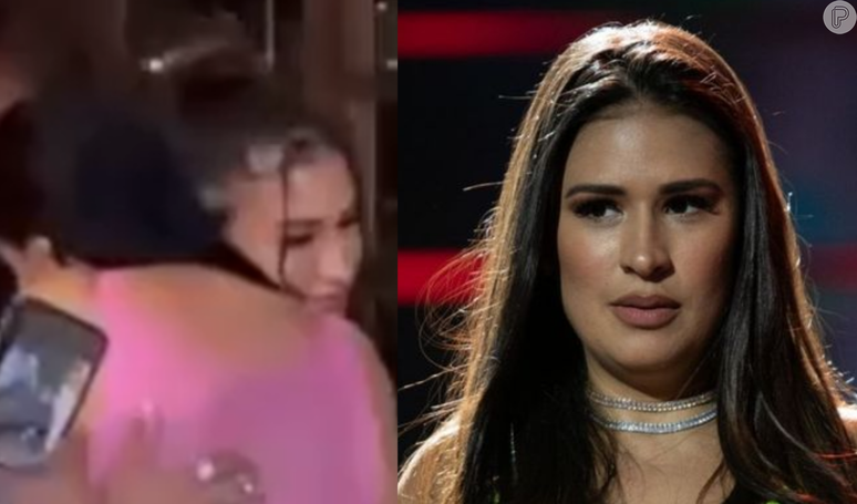 Simone permanece de mãos dadas com essa terceira mulher durante todo o abraço de Simaria, que parece falar algo no ouvido da irmã.