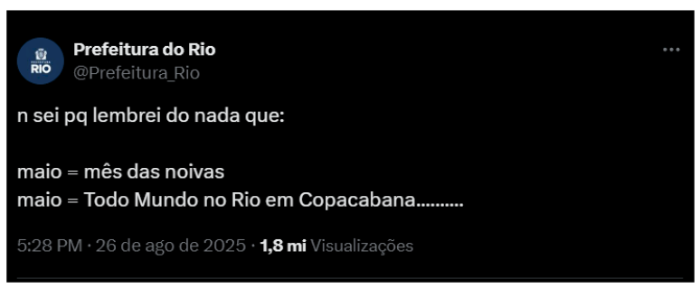 Com uma frase aparentemente simples — "maio = mês das noivas" e "maio = todo mundo no Rio, em Copacabana" —, o texto rapidamente se tornou combustível para especulações. A coincidência entre o mês tradicionalmente associado a casamentos e o recente anúncio do noivado de Taylor Swift com Travis Kelce foi suficiente para que os fãs começassem a imaginar uma apresentação especial da artista na capital fluminense.
