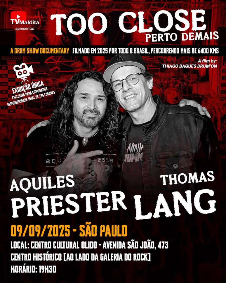 Um novo documentário retratará os bastidores da recente turnê brasileira realizada pelos bateristas Aquiles Priester e Thomas Lang. "Too Close - Perto Demais" terá sua estreia no Centro Cultural Olido, em São Paulo, no próximo dia 9 de setembro, às 19h30. Ingressos estão à venda no site oficial de Aquiles.