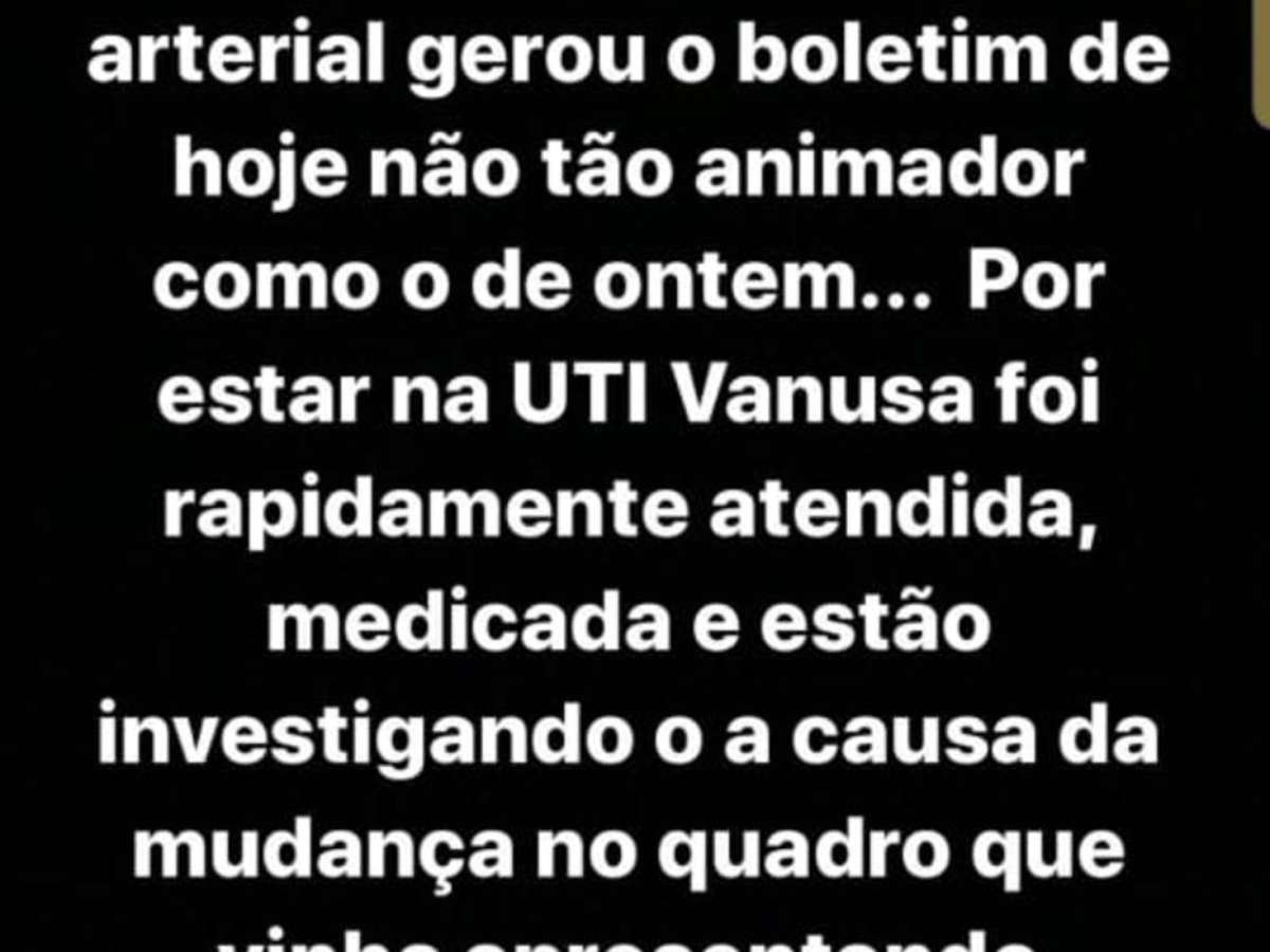 Nas redes sociais, o filho da cantora, Rafael Vanucci, disse que "uma alteração na pressão arterial gerou o boletim de hoje, não tão animador". Segundo ele, como Vanusa está na UTI o atendimento foi rápido e os médicos estão investigando as causas da mudança do quadro, que vinha apresentando melhoras.
