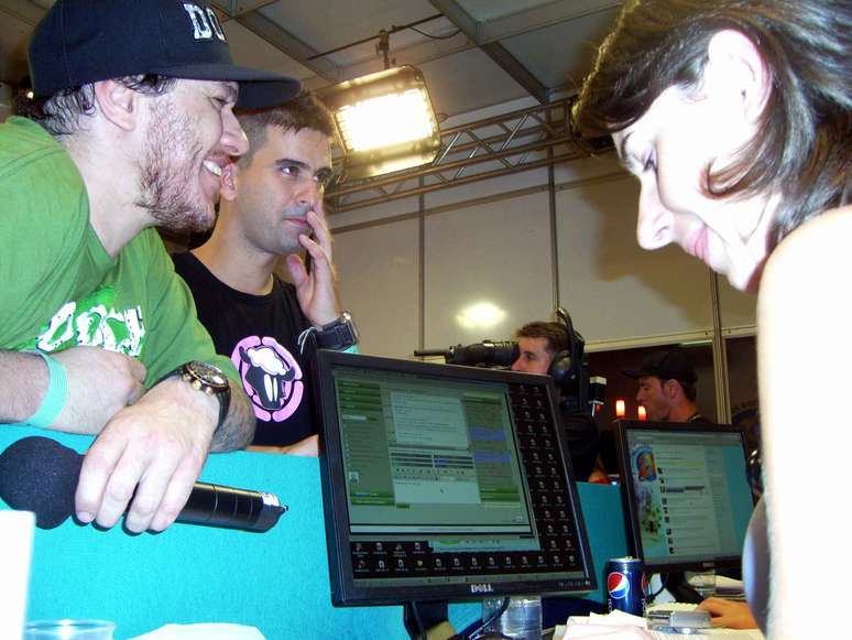 O vocalista do Charlie Brown Jr. participa de bate-papo com internautas nos bastidores de um festival em 2011. À direita, a editora-executiva do Terra Alexandra Zanela no encontro que mudou sua opinião