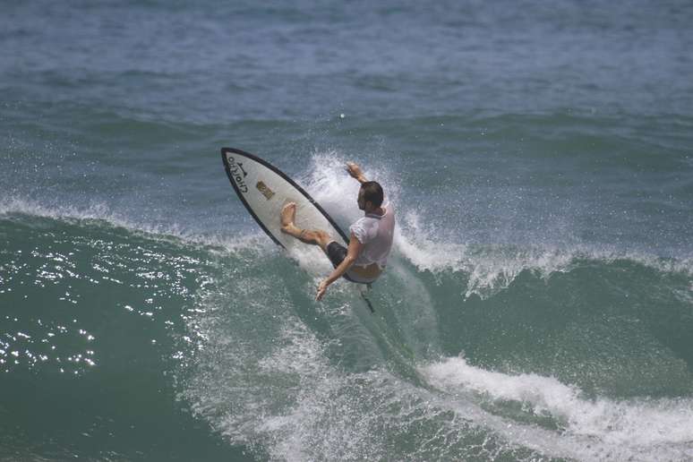 Paulinho Vilhena homenageou o cantor Chorão, que foi encontrado morto na madrugada desta quarta-feira (6), ao escrever o nome do músico e desenhar um skate em sua prancha de surfe. Paulinho foi clicado na Prainha, no Rio de Janeiro