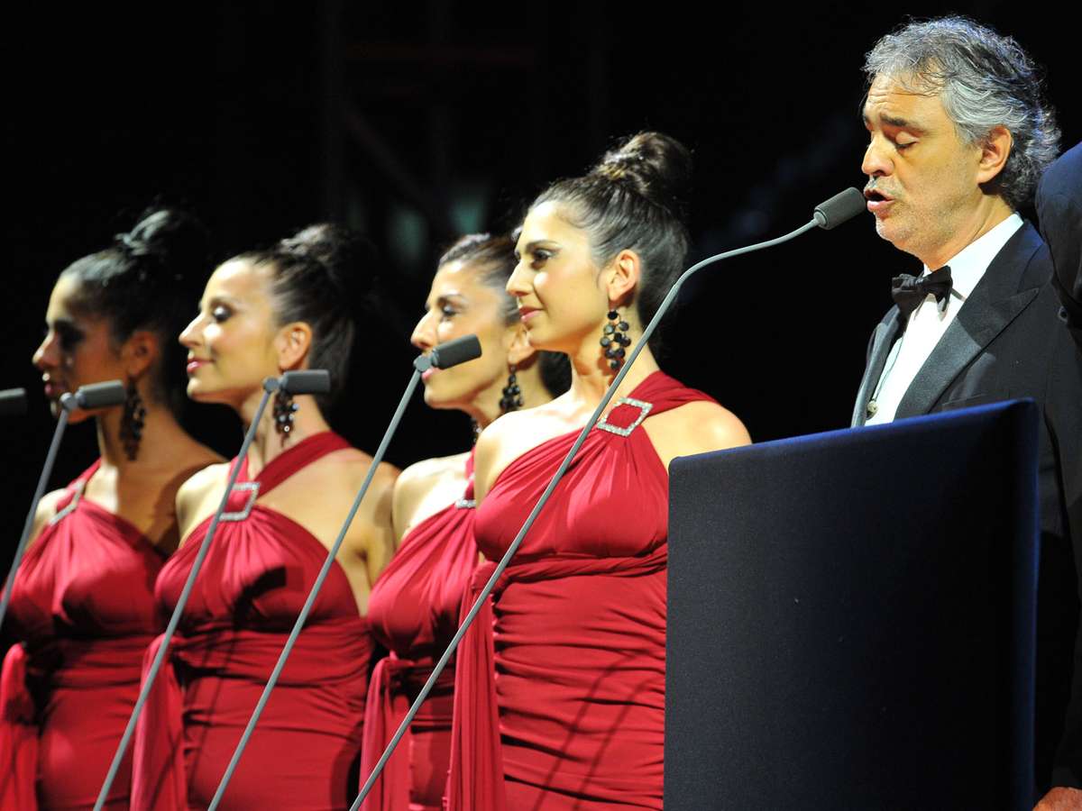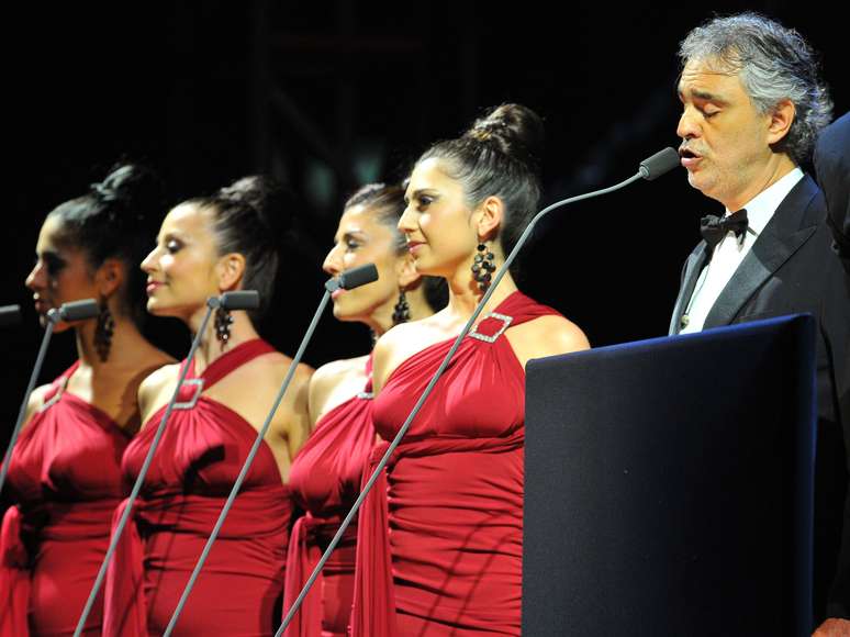 Andrea Bocelli recebeu Sandy, com quem gravou a canção 'Vivo Por Ella', no palco de sua única apresentação em São Paulo, nesta quinta-feira (13), no Jockey Club. Com ingressos que chegavam a R$ 2 mil, produção esperava 25 mil pessoas no show