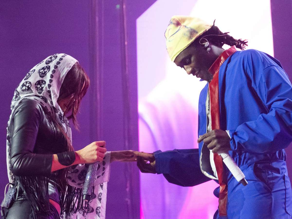 Após o show, o casal recém-noivo exibiu a pedra enorme e posou para fotos nos bastidores.