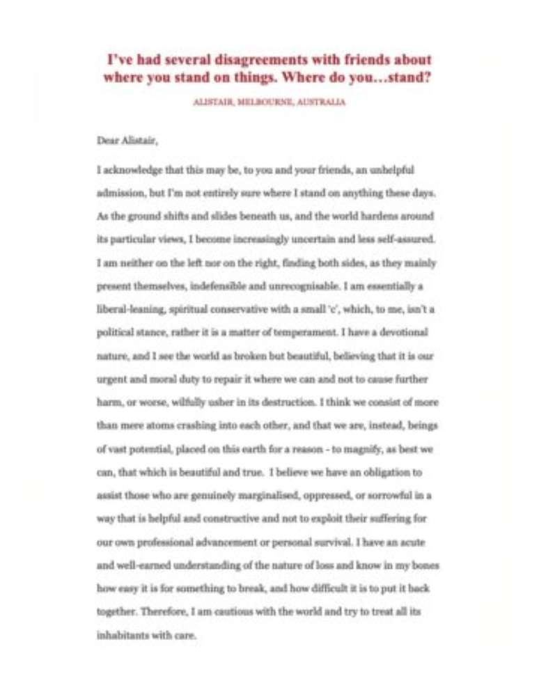 "Suponho que, no final, valorizo ações sobre palavras", concluiu. "Estou começando a entender onde me posiciono, me posiciono com o mundo, em sua bondade e beleza. Nestes tempos histéricos, monocromáticos e combativos, eu clamo à sua alma […] Eu canto para ela, a elogio, a encorajo e me esforço para melhorá-la — em adoração, reconciliação e fé pulsante."