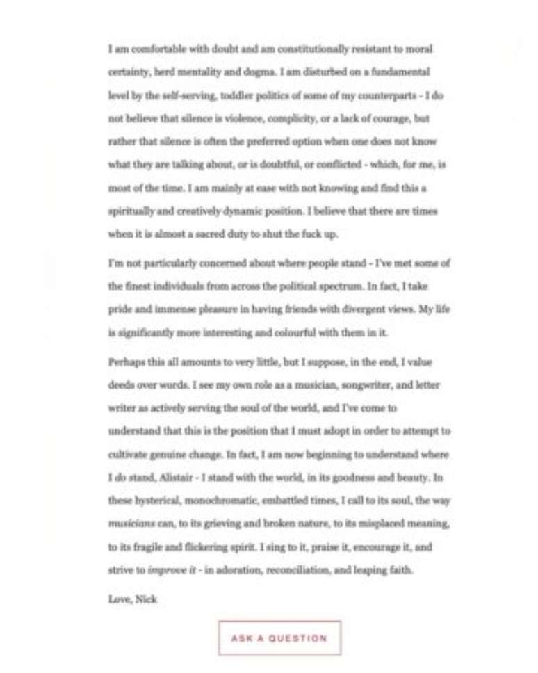 "Não tenho certeza de onde me posiciono sobre nada atualmente. À medida que o chão desliza sob nossos pés e o mundo se endurece em torno de suas visões particulares, torno-me cada vez mais incerto e menos autoconfiante", escreveu Cave.