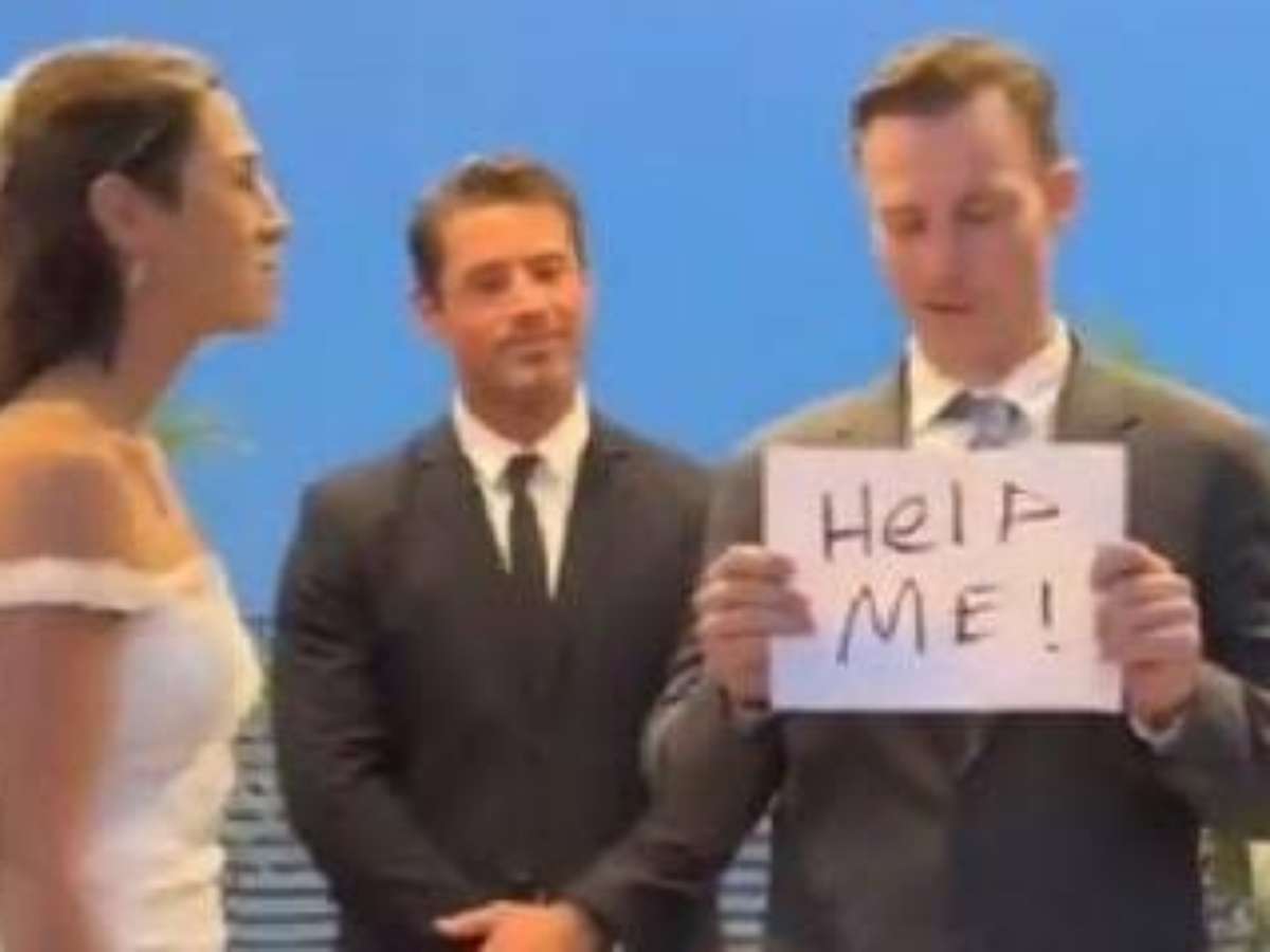 Na hora dos votos, o noivo pegou um papel do bolso e surpreendeu a mulher ao abrir e exibir aos convidados o bilhete escrito: "HELP ME" ('Ajude-me').