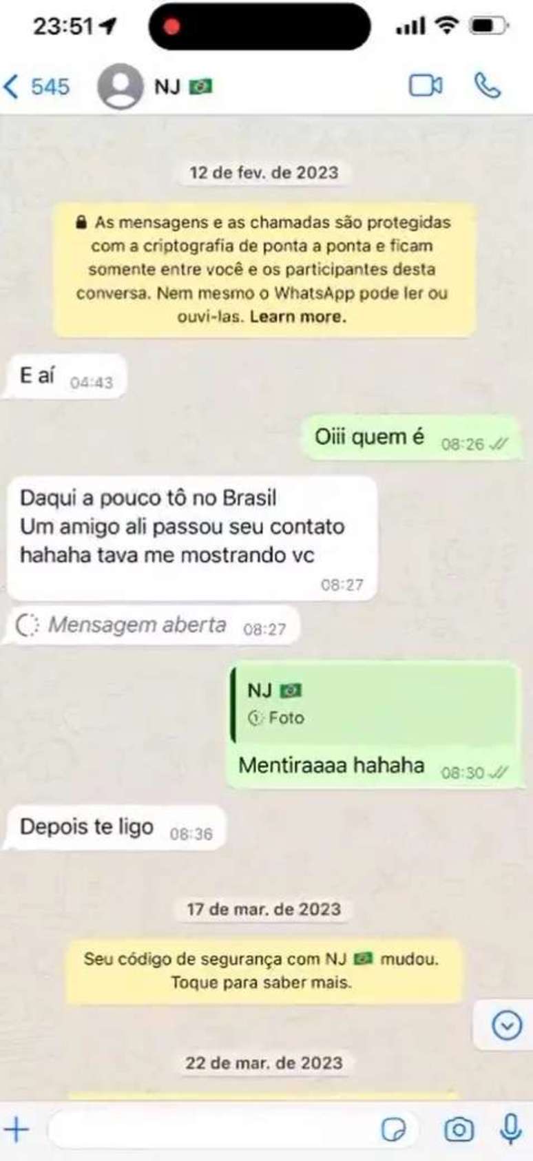 A curta conversa divulgada ocorreu em fevereiro de 2023 e, em uma das mensagens enviadas, Neymar disse: "Daqui a pouco tô no Brasil. Um amigo ali passou seu contato, hahaha. tava me mostrando você". Além disso, ele enviou uma foto de visualização única. Aline respondeu com risadas e escreveu: "Mentira!". Por fim, o jogador comentou "Depois te ligo", e a conversa acabou por aí.