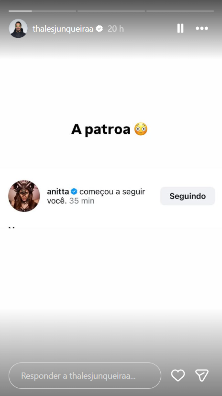 Até o momento, Anitta não comentou sobre o assunto. A cantora também não interagiu publicamente com Thales além do "follow".
