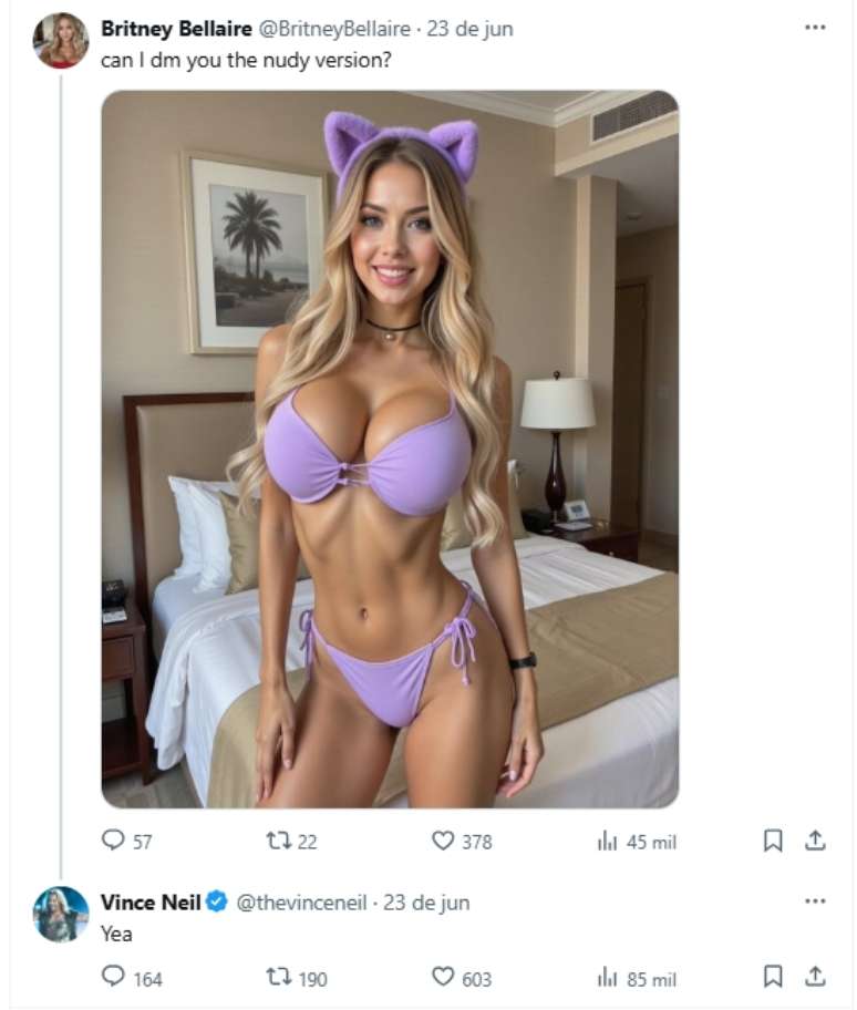 Depois que ele respondeu "sim" para o perfil de Britney Bellaire, que prometia enviar um nude para quem interagisse com o post, fãs tentaram alertar Vince de que, provavelmente, trata-se uma mulher criada por inteligência artificial.
