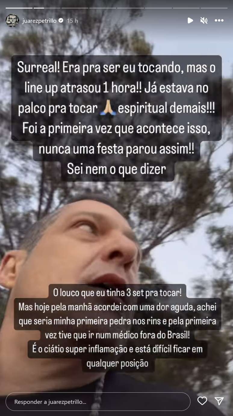 O DJ compartilhou sua experiência nas redes sociais. "Universo Paralello Israel. Estou em choque até agora! E as bombas não param de explodir… Depois, conto mais detalhes", escreveu Petrillo. Em um vídeo, ele acrescentou: "Gente, acabou a festa porque está tendo bombas. Estou chocado".