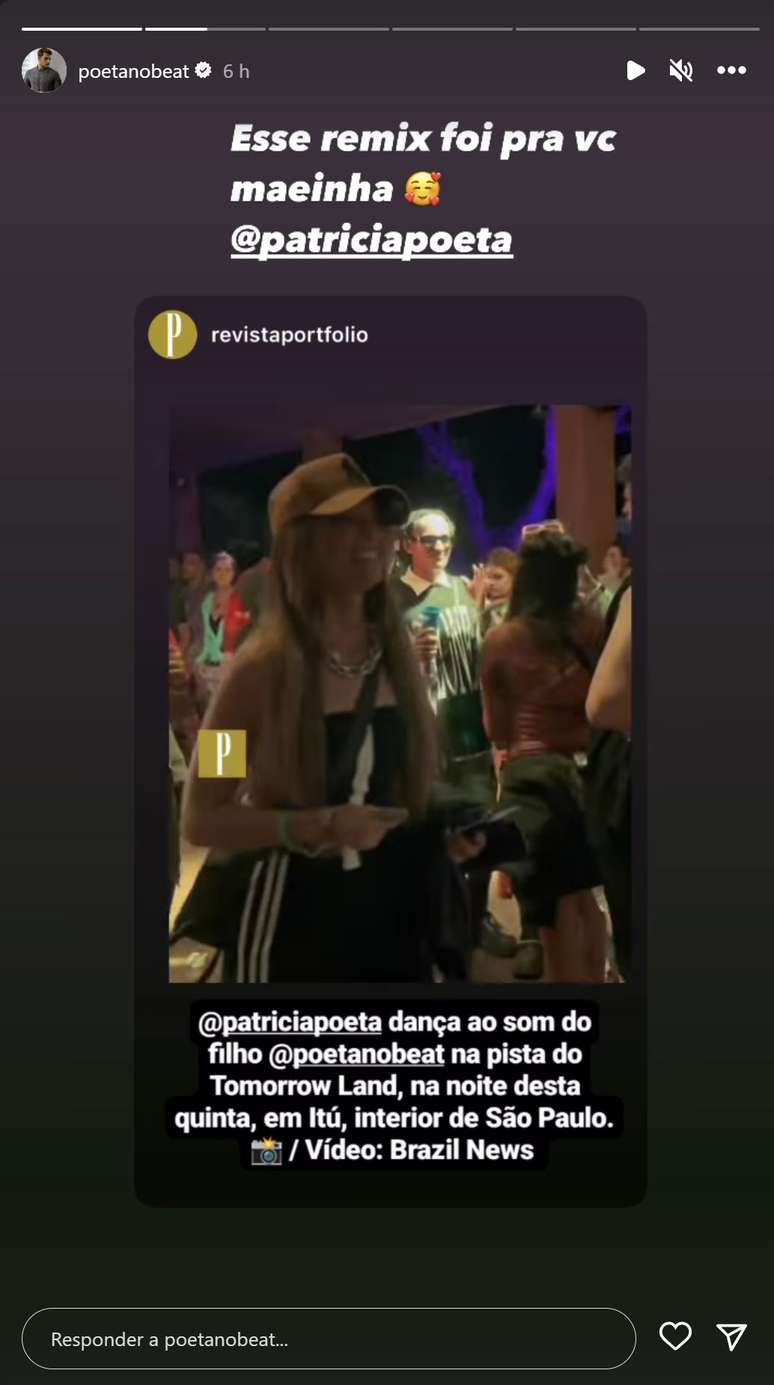 A apresentadora Patrícia Poeta foi uma atração à parte no primeiro dia do Tomorrowland Brasil, que aconteceu em Itu, interior de São Paulo, na quinta-feira (12/10). Ela foi tietar a discotecagem de seu filho DJ, Felipe Poeta, de apenas 21 anos. Enquanto tirava várias fotos, foi surpreendida com uma homenagem. O jovem DJ tocou uma versão house de uma música favorita da mãe, "Tá Perdoado", de Maria Rita, durante seu set.