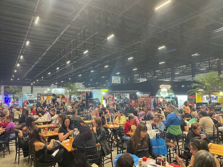 O espaço conta com quatro praças de alimentação. A maior delas fica próxima à entrada, à direita, e ocupa boa parte do corredor. As outras ficam no extremo oposto, no fim do pavilhão. No mapa do evento, aparecem separadas, mas quem passar por lá vai perceber que são dividas apenas por saídas de emergência.